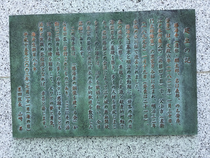 勝海舟(通称・麟太郎、名は義邦、のち安房、安芳)は、文政六年(1823年)一月三十日、江戸本所亀沢町(両国四丁目)で、父小吉(左衛門太郎惟寅)の実家男谷邸に生まれ、明治三十二年(1899年)一月十九日(発表は二十一日)赤坂の氷川邸で逝去されました。勝海舟は幕末と明治の激動期に、世界の中の日本の進路を洞察し、卓越した見識と献身的行動で海国日本の基礎を築き、多くの人材を育成しました。西郷隆盛との会談によって江戸城の無血開城をとりきめた海舟は、江戸を戦禍から救い、今日の東京の発展と近代日本の平和的軌道を敷設した英雄であります。この海舟像は、「勝海舟の銅像を建てる会」から墨田区に寄贈されたものであり、ここにその活動にご協力を賜った多くの方々に感謝するとともに、海舟の功績を顕彰して、人びとの夢と勇気、活力と実践の発信源となれば、幸甚と存じます。