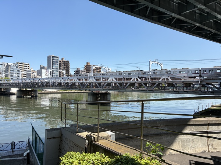 北十間川が隅田川から分岐する地点と浅草を結んで東武鉄道の鉄橋が架かっています。かっては電車が通るだけでしたが、令和二年(2020年)に橋梁沿いの歩道橋「すみだリバーウォーク」がオープンしました。午前7時から午後10時まで解放され、徒歩で自由に渡ることができます。床面に隅田川を見下ろすのぞき窓があるほか、東京スカイツリー公式キャラクターの「ソラカラちゃん」のイラストが隠されているなど、遊び心あふれる趣向も凝らしています。鉄道の橋梁や東武鉄道の車両が走る様子を間近に見ることができるので、鉄道好きにも楽しめます。