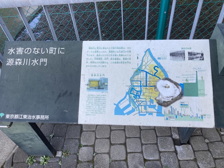 江東三角地帯には、小名木川、北十間川などの堀状の内部河川が縦横に流れています。源森川水門は、北十間川が隅田川に合流する地点に設けられ、平常時は開放されていますが、台風が接近し高潮のおそれのある場合はもちろん、台風以外でも高潮位が予想されるどきは閉鎖します。また、地震により津波のおそれが生じたときは、ただちに閉鎖します。このように水門は、通常は内部河川への出入