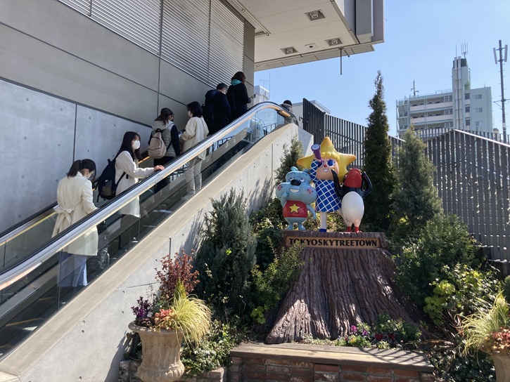 スカイツリーにやってきました。スカイツリータウン入口の階段脇には、ソラカラちゃん・テッペンペン・スコブルブル3人(?)のキャラクターが健在です。