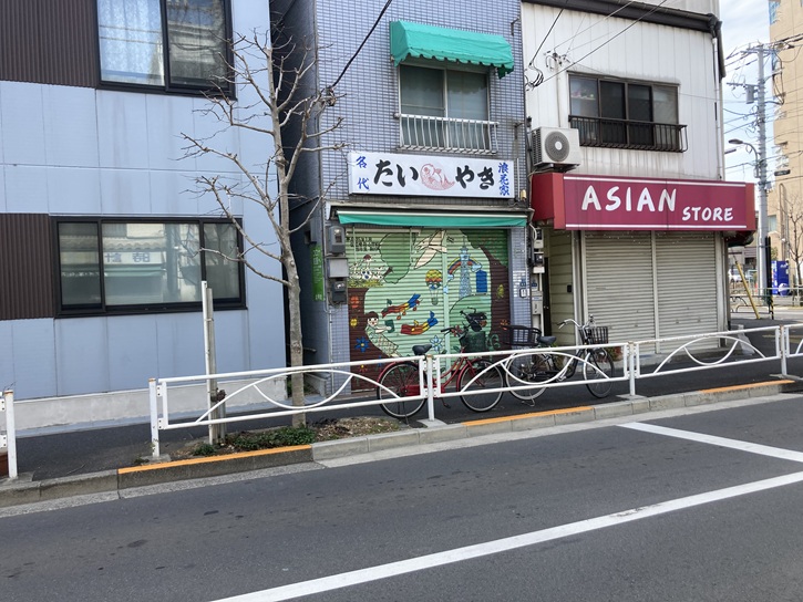 通りには新旧取り混ぜたお店が見られます。浪花家は、麻布十番浪花家総本店の暖簾分け店である両国浪花家本店で修行した主人が昭和三十五年に独立・開店したお店です。鯛焼き以外においなりさん・かんぴょう巻き・おにぎりも売っています。鯛焼きは薄皮にあんこがタップリ入っています。あんこがたくさん入るように、通常の鉢型より彫が深めな特注品を使っているらしいです。パリッと焼けた香ばしい皮がとても美味しく、あんこも甘すぎず上品な味です。最初に訪れた2022年3月時点では営業していましたが(シャッターは閉まっていましたが)、残念ながら2025年5月に再訪したときは閉店していました。「東京えんとつ」は、ぎっしりとクリームが詰まった東京えんとつの工房直営店です。店頭の看板には「下町のケーキ屋さん」と書いてありますが、色々なケーキが置いてあるのではなく、ショーケースに並んでいるのは「日向夏のタルト」以外は全て「東京えんとつ」です。カップケーキの様な形のシフォンケーキで、中にクリームが入っています。プレーンの他、苺・チョコ・メロンの載ったものもあります。お店のお勧めは「プレーン」で、ふわふわのシフォン生地にカスタードとホイップが2層構造になったクリームが入っています。