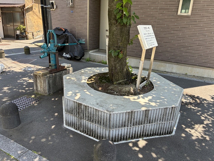 通りの脇の小さな広場に年代物の手押しポンプが据え付けられています。昔、下町ではよく見られた風景です。