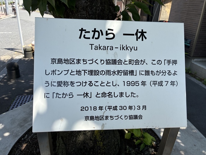 京島地区まちづくり協議会と町会が、この「手押しポンプと地下埋設の雨水貯留槽」に誰もが分るように愛称をつけることとし、平成七年(1995年)に「たから一休」と命名しました。