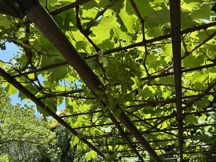 右手奥には多彩な果樹の木が植えられています。ブドウの木も実を付け始めています。