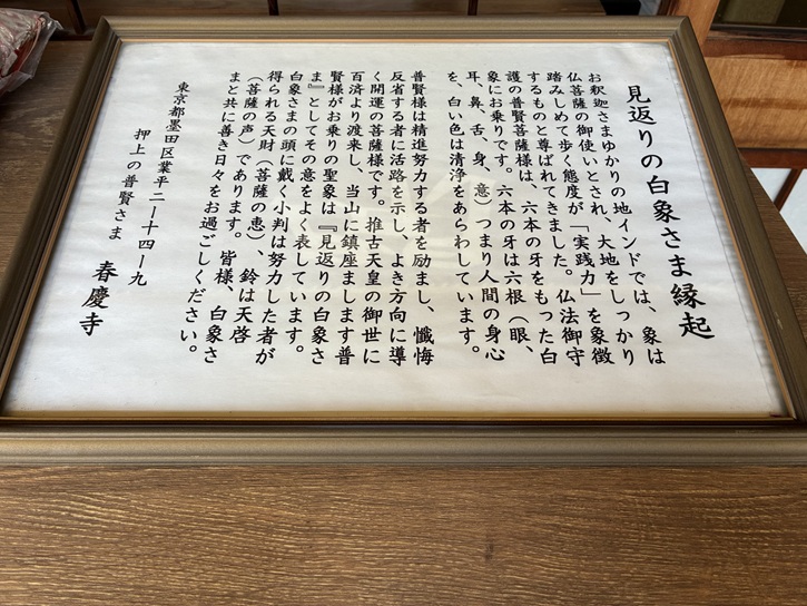 普賢様は精進努力する者を励まし、懺悔反省する者に活路を示し、よき方向に導く開運の菩薩様です。推古天皇の御世に百済より渡来し、当山に鎮座まします普賢様がお乗りの聖象は「見返りの白象さま」としてその意をよく表しています。白象さまの頭に戴く小判は努力した者が得られる天財(菩薩の恵)、鈴は天啓(菩薩の声)であります。皆様、白象さまと共に善き日々をお過ごしください。