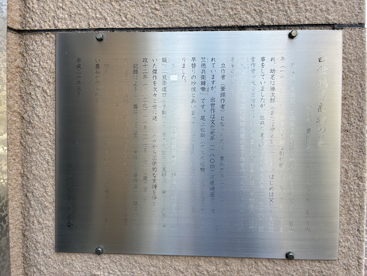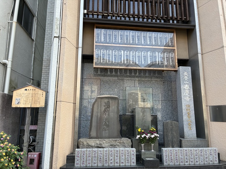 鬼平の親友岸井左馬之助の寄宿先としてたびたび登場している春慶寺ですが、春慶寺入口に俳優の江守徹が揮毫した岸井左馬之助寄宿之寺碑が建てられています。また、墨田区による街歩き観光推進の一環として、「鬼平犯科帳」の縁を紹介する案内板も設置されています。