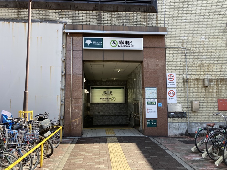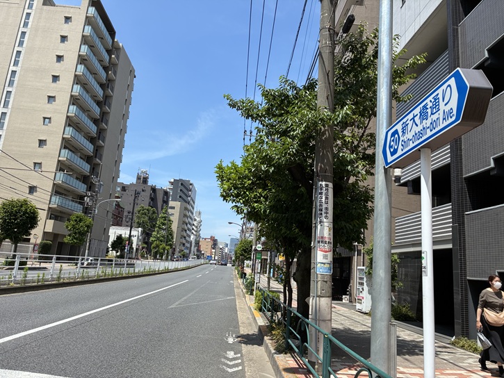 スタート地点の都営新宿線菊川駅出入口A2から新大橋通りを西に向かいます。