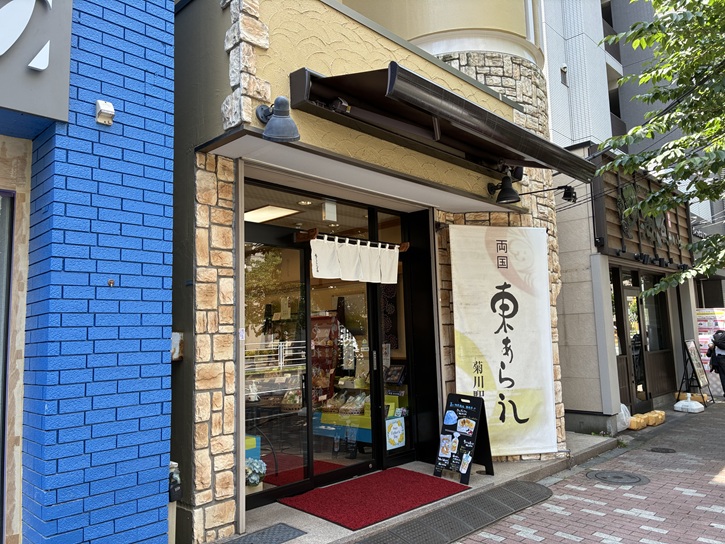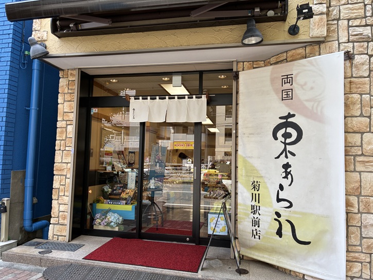 出入口A2の直ぐ先に東あられ菊川駅前店があります。本店は両国にありますが、足の遠いお客の要望に応えて、平成十七年早春に菊川駅前店を開店したそうです。この辺りにはあられの好きな方が多いのでしょう。炭・米問屋を営んでいた初代小林桝恵美が、取引先であったあられ・おかき業の「江戸あられ」の主人が関西に戻ることを期に、機械や技術などを引き継ぎ、現本店所在地であられ・おかきの製造元の東京元祖「東あられ」を明治四十三年(1910年)に創業したのが現在の「東あられ本鋪」の始まりです。取引先より引き継いだ「江戸あられ」の更なる発展を期し、江戸を含む東(あずま/西の京都に対する東)として「東あられ」と命名しました。