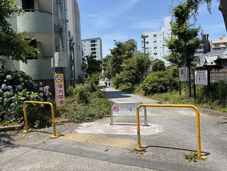 路地の先で左手方向に延びる小さな公園があります。この公園は、かってここを流れていた五間堀を埋め立てて、その跡地を公園にしたものです。