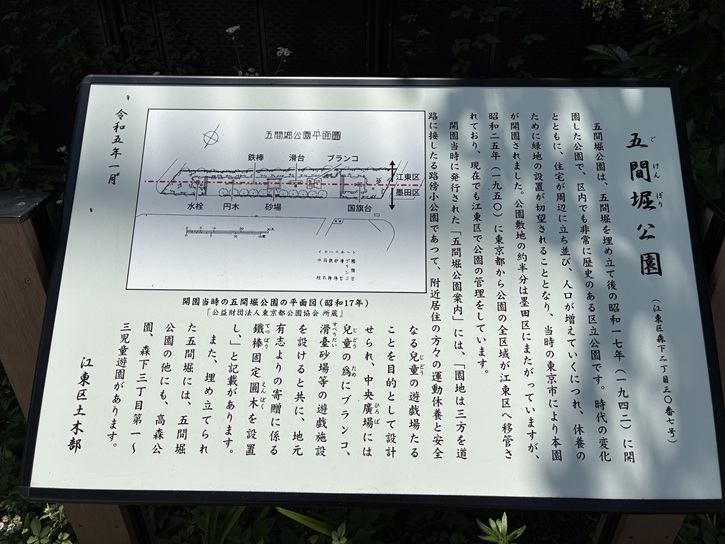 五間堀公園は、五間堀を埋め立て後の昭和十七年(1942年)に開園した公園で、区内でも非常に歴史のある区立公園です。時代の変化とともに、住宅が周辺に立ち並び、人口が増えていくにつれ、休養のために緑地の設置が切望されることとなり、当時の東京市により本園が開園されました。公園敷地の約半分は墨田区にまたがっていますが、昭和二十五年(1950年)に東京都から公園の全区域が江東区へ移管されており、現在でも江東区で公園の管理をしています。開園当時に発行された「五間堀公園案内」には、「園地は三方を道路に接したる路傍小公園であって、附近居住の方々の運動休養と安全なる兒童の遊戯場たることを目的として設計せられ、中央廣場には兒童の為にブランコ、滑臺砂場等の遊戯施設を設けると共に、地元有志よりの寄贈に係る鐵棒固定圓木を設置し、」と記載があります。また、埋め立てられた五間堀には、五間堀公園の他にも、高森公園、森下三丁目第一〜第三児童遊園があります。