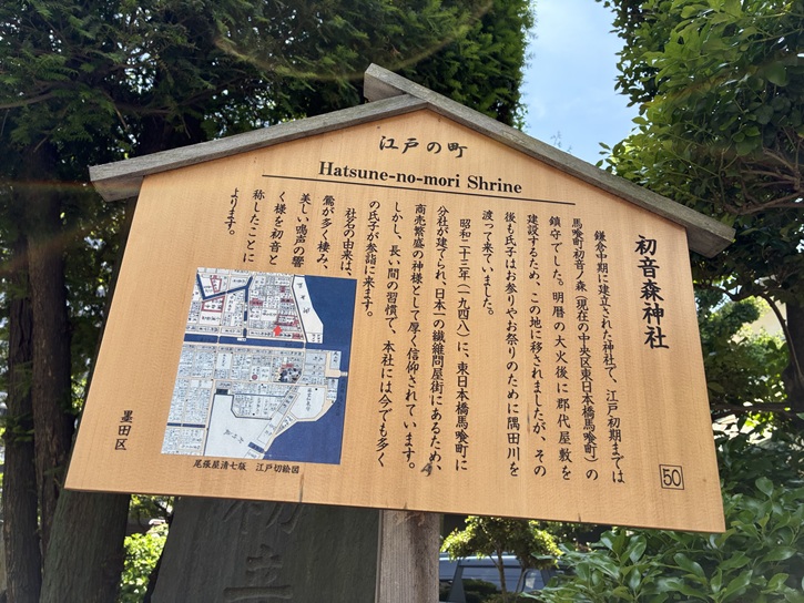 鎌倉中期に建立された神社で、江戸初期までは馬喰町初音ノ森(現在の中央区東日本橋馬喰町)の鎮守でした。明暦の大火後に郡代屋敷を建設するため、この地に移されましたが、その後も氏子はお参りやお祭りのために隅田川を渡って来ていました。昭和二十三年(1948年)に、東日本橋馬喰町に分社が建てられ、日本一の繊維問屋街にあるため、商売繁盛の神様として厚く信仰されています。しかし、長い間の習慣で、本社には今でも多くの氏子が参詣に来ます。社名の由来は、鶯が多く棲み、美しい鳴声の響く様を初音と称したことによります。