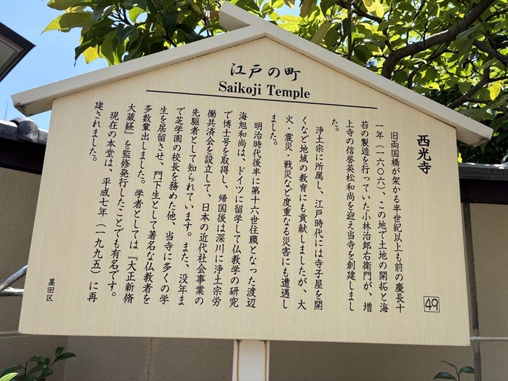 初音森神社の先に、西光寺があります。西光寺は、慶長十一年(1606年)に小林治右衛門により開基されました。彼の子孫は商人となり、後に深川に住んでいます。明治時代後期に西光寺の住職となった渡辺海旭は、旧制芝中学校(現在の芝中学校・高等学校)の校長を務めたり、セツルメント運動に関わるなど多方面で活躍しました。