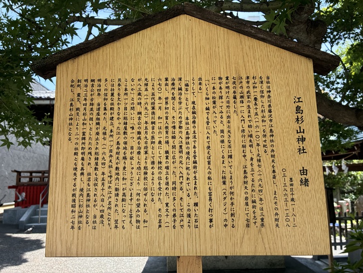 ここは江戸時代、関東周辺の琵琶法師や鍼灸師、按摩などの盲人を統括していた総禄(録?)屋敷の跡です。杉山和一は慶長十五年(1610年)、伊勢国安濃津(三重県津市)で生まれました。幼時に失明、はじめ江戸の山瀬検校に鍼灸を師事しましたが、後に京都の鍼師入江豊明に弟子入りしました。厳しい修業の後、江ノ島の岩窟で断食祈願を行いました。その満願の明け方、霊夢を通して新しい鍼管術を考案しました。杉山流管鍼術は、鍼を管に入れ、的確にツボを押さえるという画期的なものでした。その後の和一の名声は日増しに高まり、寛文十年(1670年)、検校に任じられました。さらに五代将軍綱吉の治療の功で褒美を尋ねられ、和一は目を請いました。綱吉は一ツ目(本所一之橋際の土地)と関東総禄(録?)検校職を与えたと伝えられています。時に元禄六年(1693年)六月のことでした。一町四方(約一万二千平方メートル)の土地に総禄(録?)屋敷と神社が建てられ、現在の場所には鍼治講習所もありました。現在の神社の名は、土地の拝領者と厚い信仰をささげた江ノ島弁財天を意味します。社殿の南側には江ノ島の岩窟を模した洞窟があります。