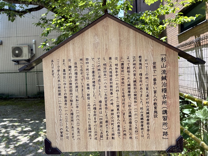 かつてこの地には盲人達が杉山流鍼按摩術を学んだ教育施設・稽古所がありました。杉山流鍼按摩術とは、江戸時代の盲人鍼医杉山検校和一(1610年〜1694年)によって創始された鍼按摩術で、「杉山流鍼治稽古所」の他に「講習所」「学校」とも呼ばれていました。この地には、明和年中(1764年〜1772年)関東の盲人の最高位で、第二十五代惣禄(録?)若村検校春一の時、神田小川町より移転し、明治四年(1871年)太政官布告により廃止されるまでこの地に存在しました。稽古所は「四間余に五間」で、二十畳余の建物でした。この稽古所を中心に江戸近郊四ヶ所(千住・板橋・新宿・品川)、さらに全国四十五ヶ所へと広がっていきました。当地の稽古所の源は、天和二年(1682年)九月十八日、麹町の杉山検校邸内で始まった稽古所にあります。また、墨田区にゆかりの勝海舟(1823年〜1899年)は、ここで学んだ米山検校銀一(1702年〜1772年)の曾孫にあたります。