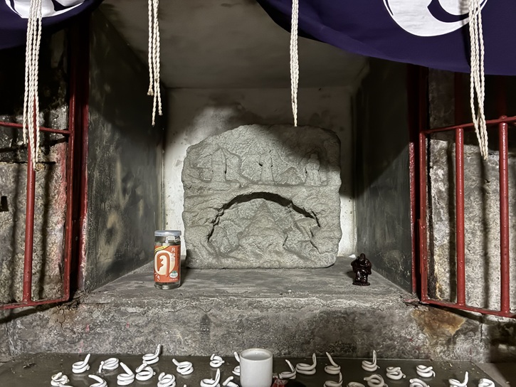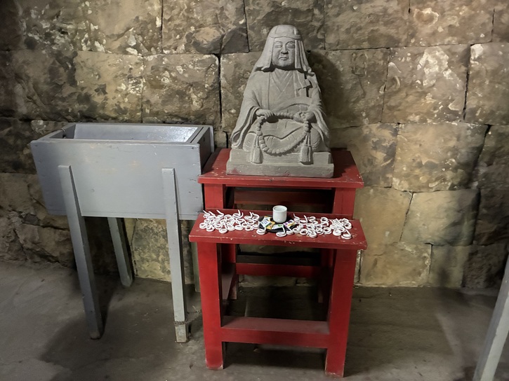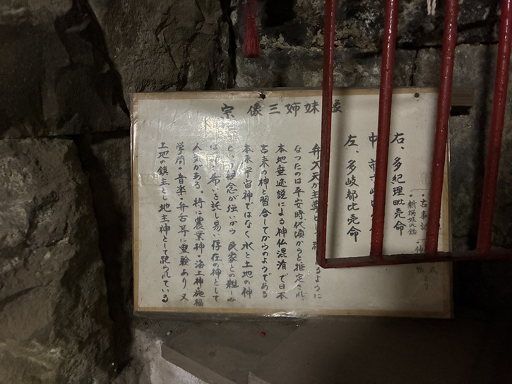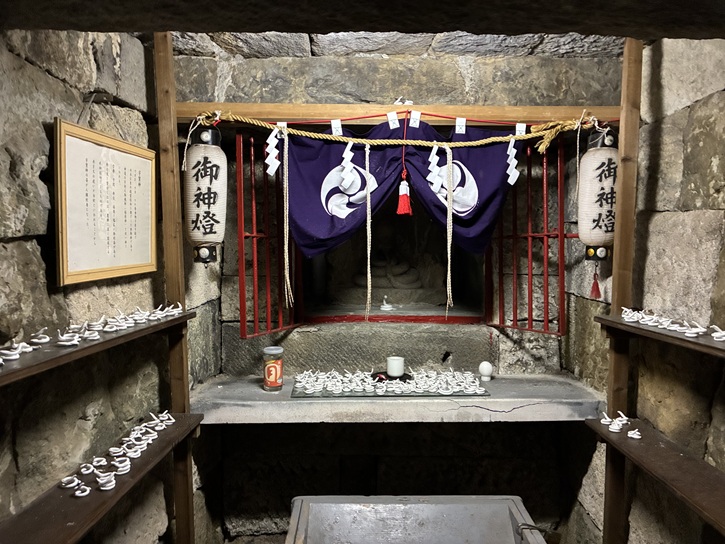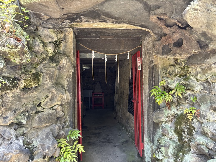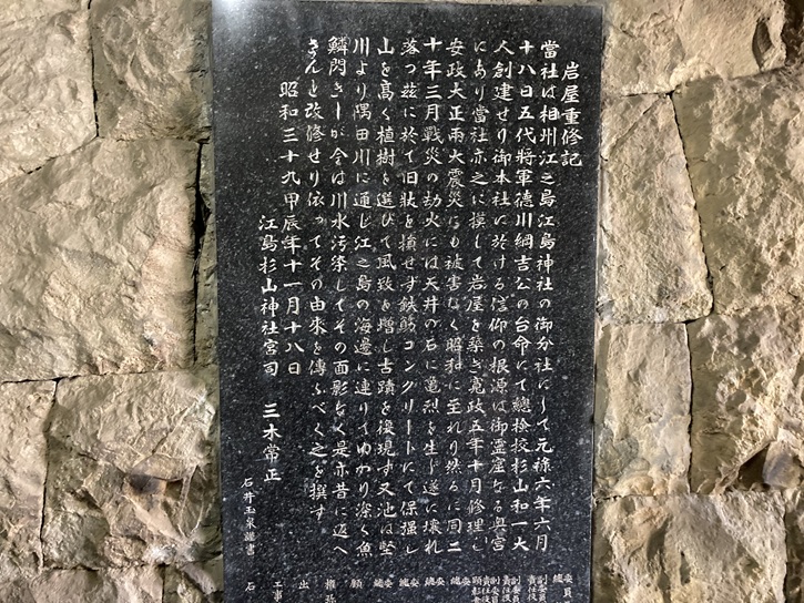 岩屋は相州江ノ島の洞窟を模して寛政五年に造られました。宗像三神(田紀理比売命・市杵島比売命・多紀津比売命)、杉山和一総検校、宇賀神(人頭蛇尾)が祀られています。入口脇に岩屋の改修碑が掛けられています。