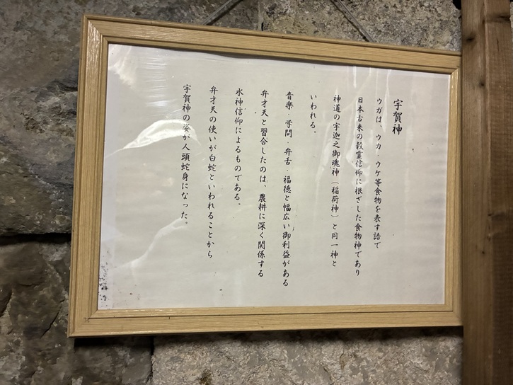 ウガは、ウカ・ウケ等食物を表す語で日本古来の穀霊信仰に根ざした食物神であり、神道の宇迦之御魂神(稲荷神)と同一神といわれる。音楽・学問・弁舌・福徳と幅広い御利益がある弁才天と習合したのは、農耕に深く関係する水神信仰によるものである。弁才天の使いが白蛇といわれることから宇賀神の姿が人頭蛇身になった。