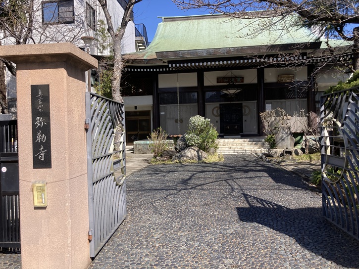 本所二之橋南交差点で右折し、再び清澄通りに入ります。先ほど曲がった交差点を今度は左折しますと、左手に弥勒寺があります。弥勒寺は、慶長十五年(1610年)に僧宥鑁によって創建された後、元禄二年(1689年)に現在地に移転しました。弥勒寺は真言宗関東四ヶ寺のひとつとしての重要な役割を果たし、徳川光圀から寄進された薬師如来像など、江戸十三薬師のひとつとして、また御府内八十八ヶ所霊場の46番札所としても知られ、寺領100石の朱印状を拝領するなど、歴史的重要性の高いお寺です。お寺の門前には、「贈正五位杉山総検校墓所」の石碑が建っています。