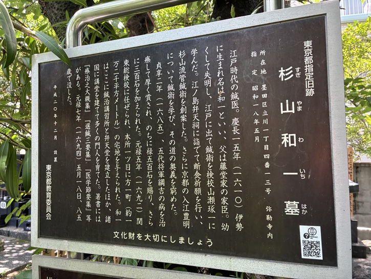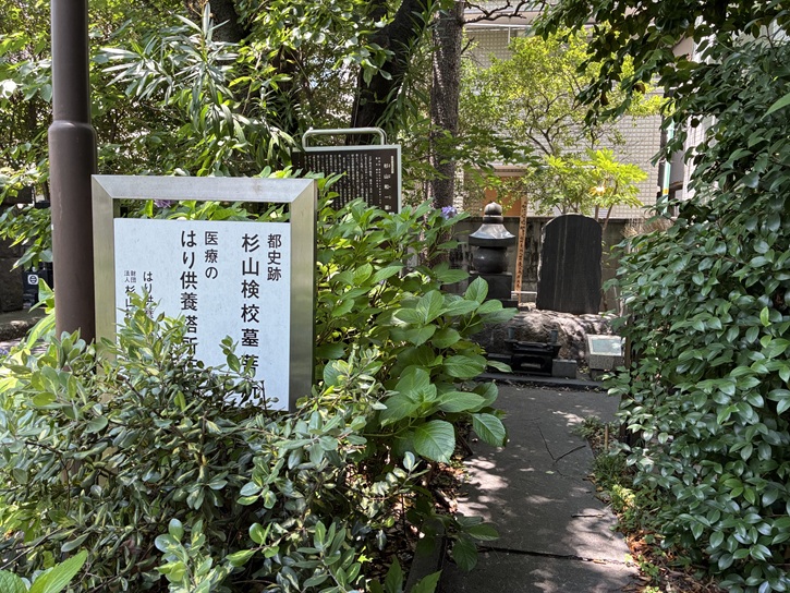 本堂の左手奥には、杉山和一の墓所があります。杉山和一は、伊勢国安濃津(現在の三重県津市)出身の鍼灸師で、検校(盲人の役職の最高位の名称)であることから「杉山検校」とも称されます。鍼を管に通して打つ施術法である杉山流管鍼(かんしん)法を創始したと伝えられ、鍼・按摩技術の取得教育を主眼とした世界初の視覚障害者教育施設とされる「杉山流鍼治導引稽古所」を開設しました。