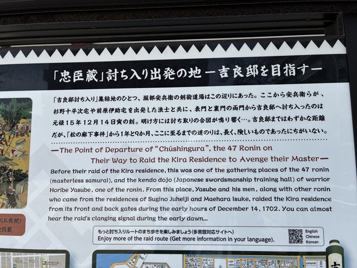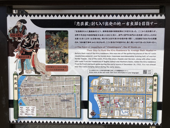 令和三年(2021年)8月には、吉良邸の跡地である本所松坂町公園までの討ち入りルートや、史実に因んだエピソードなどを盛り込んだ「歴史説明板」が設置されました。