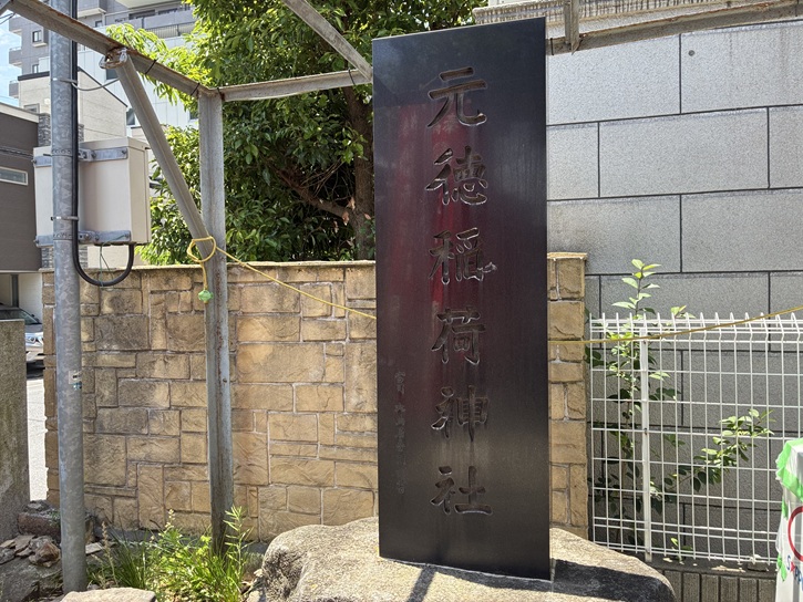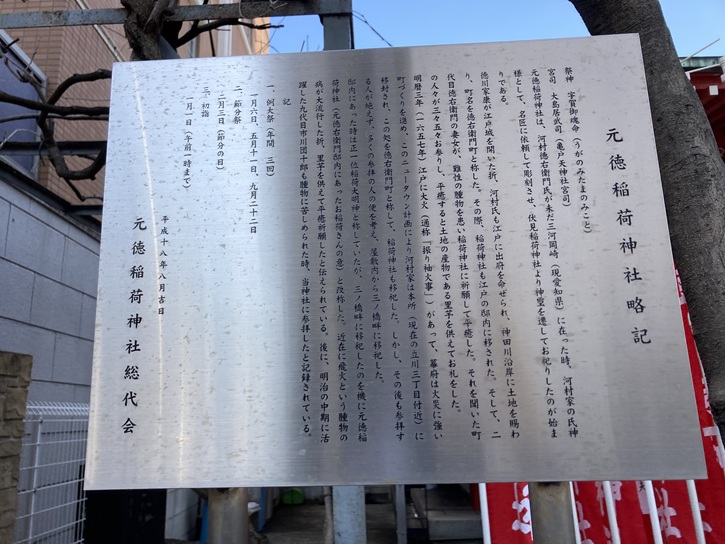 立川第二児童遊園の左手先の三ツ目通り脇に、元徳稲荷神社があります。元徳稲荷神社は、慶長年間(1596年〜1615年)に創建されました。三河国の武士河村徳右衛門は伏見稲荷大社から分霊を勧請し、自邸の屋敷神として稲荷神を祀りました。その後、徳川家康の江戸入府と幕府開設に伴い、河村徳右衛門も江戸に移住し、江戸の新邸に稲荷社を移設しました。二代目徳右衛門の時、妻に難性の腫物ができたためにこの稲荷に祈願したところ、治癒することができました。このご利益が評判を呼び、河村家の屋敷神から一般に開放されました。河村家の手から離れた際、元徳右衛門邸の稲荷ということで「元徳稲荷神社」と呼ばれるようになりました。歌舞伎の九代目市川団十郎の顔面に腫物ができた時、元徳稲荷神社に詣でて祈願したことで治ったということです。明治から縁日が開かれるようになり、戦後一時断絶しましたが、昭和四十八年(1973年)に再開されました。