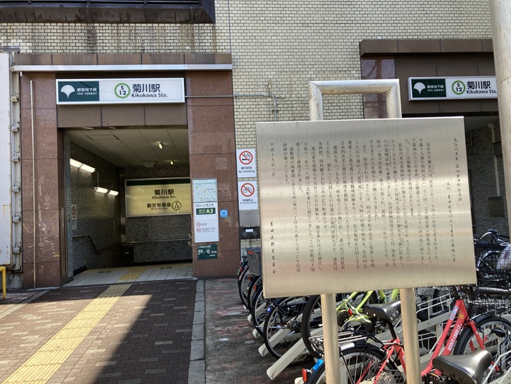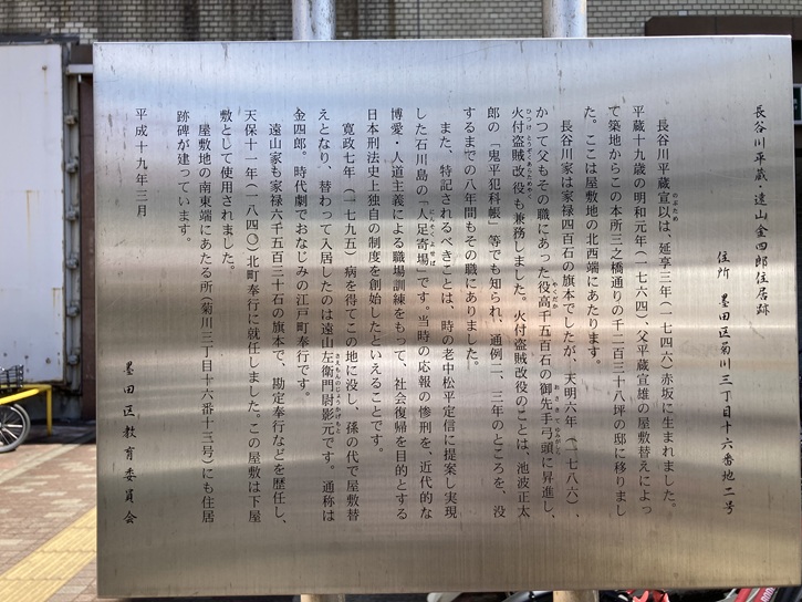 菊川駅A3出口の前に、長谷川平蔵住居跡の案内板が立っています。