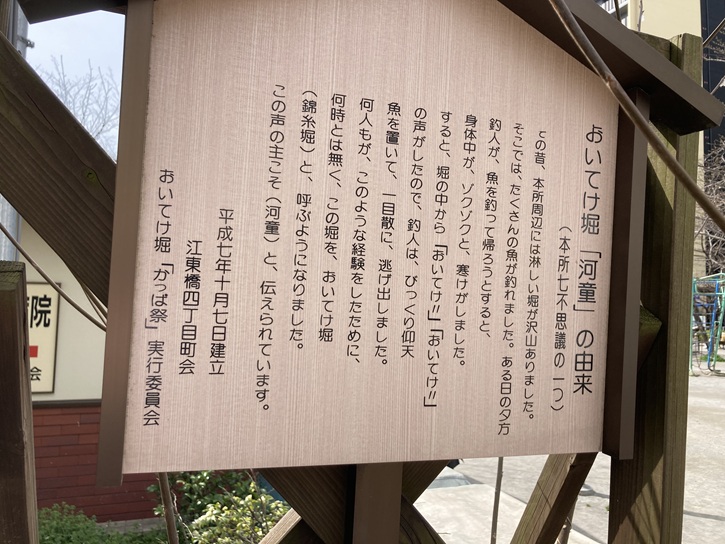 本所七不思議のひとつ「おいてけ堀」。魚を釣って帰ろうとした釣り人が堀の中から「おいてけ〜」という声に驚き、魚を放り出して逃げたという話で、舞台とされる今の錦糸堀公園に、声の主といわれるカッパ像があります。