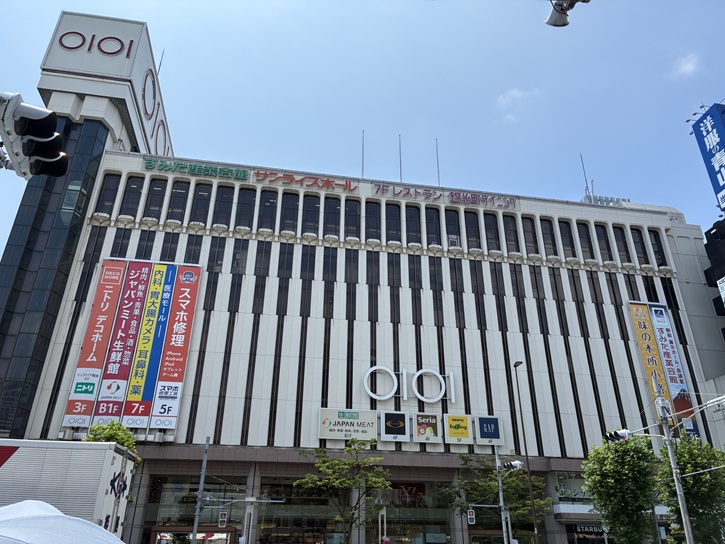魚寅に隣り合って、錦糸町マルイのビルが建っています。錦糸町マルイ(旧丸井錦糸町店)は昭和五十八年(1983年)9月2日に、かつて城東地区における東京都交通局の一大拠点であった都電錦糸堀車庫跡に開店しました。売場面積は22、990uあり、1階には”味の本所小路”、7階には”錦糸町ダイニング0141”(レストラン街)があります。また、地下には平成二十九年(2017年)6月にオープンしたジャパンミート生鮮館があります。ジャパンミートは「肉のハナマサ」を傘下にしていることもあって、松阪牛やイベリコ豚などの高級肉も販売されています。特筆すべきはワインの安さです。スペイン産のスパークリングワインは、シャンパーニュ地方のシャンパンと同じく、瓶内二次発酵を行っているので味はシャンパンと遜色なく、しかもお手頃価格です。