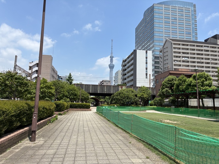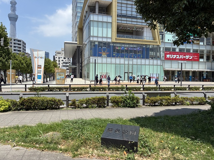 大横川を整備した総延長1、800mの親水公園です。錦糸町と押上、業平を結び、橋などを境としてエリアごとに人工のせせらぎや釣堀、広場など特徴ある施設が設けられています。