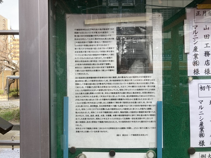 公園を入った右手に、千種稲荷神社(ちぐさいなりじんじゃ)があります。千種稲荷神社の創建年代は不詳ですが、柳島村の守護神として祀られたと伝えられています。五穀豊穣・商売繁盛だけでなく、火除けの守護神としても御利益があります。明治時代に入り、此の地が旧陸軍兵器廠錦糸堀倉庫となり、倉庫の建設によって神社は撤去されてしまいました。その後、この一帯で火災が多発するようになったため、再度神社を戻したところ火災は解消しました。しかし、戦時中に再び神社が撤去されるとまた火災が頻発するようになり、再度神社を戻したところ火災は発生しなくなり、関東大震災でも被害が殆どなかったことから、今も火除けの守護神として信仰されています。