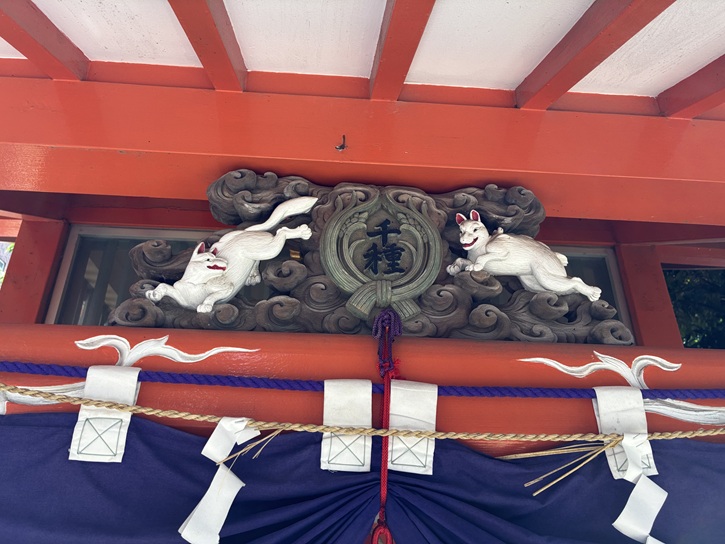 社殿の前の賽銭箱の台座には「千種講」と書かれていて、扁額に二匹の狐が跳ねている彫刻が掲げられています。