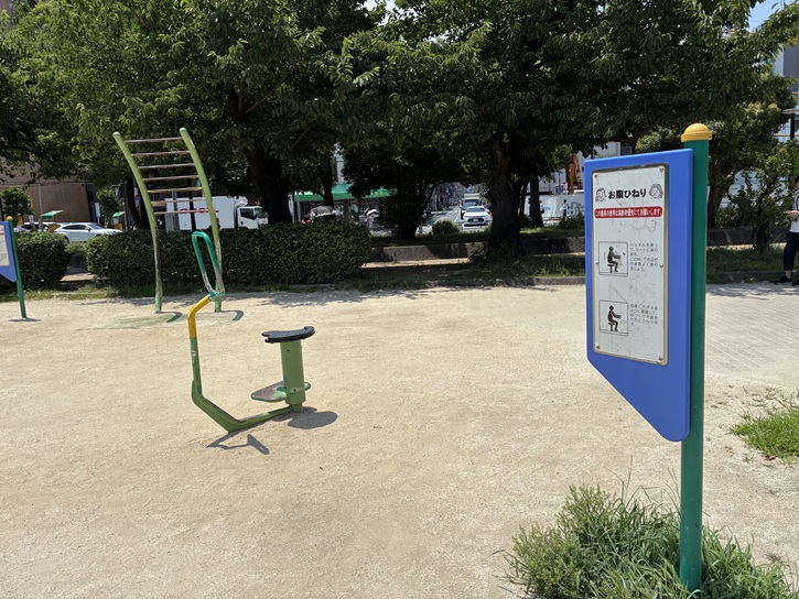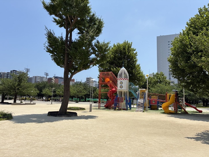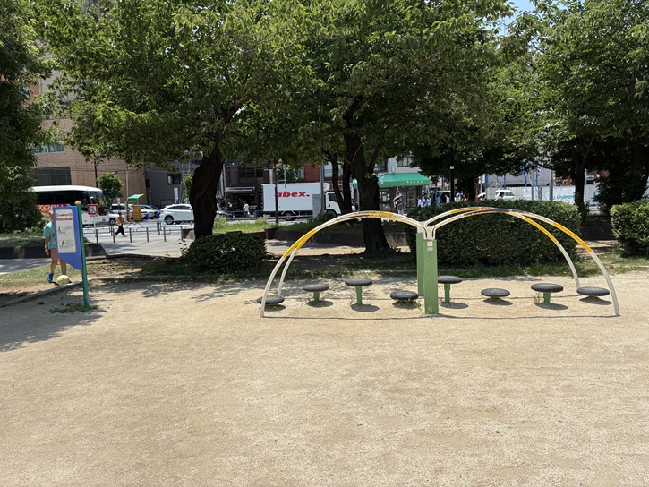 江東橋四丁目交差点を右折した先に錦糸堀公園があります。錦糸堀公園は昭和二十五年(1950年)に開園した街中の公園です。面積1、680平方メートルの土の広場に、木製のジャングルジムや、ブランコ・すべり台・フェンス付砂場などの遊具が点在しています。