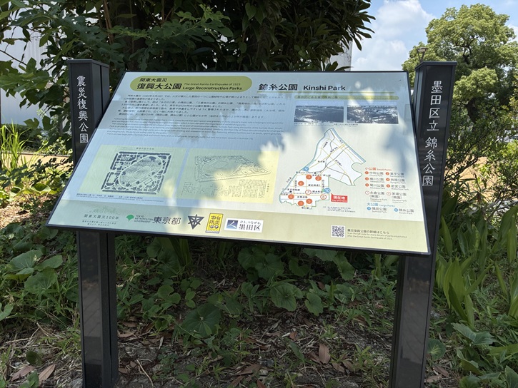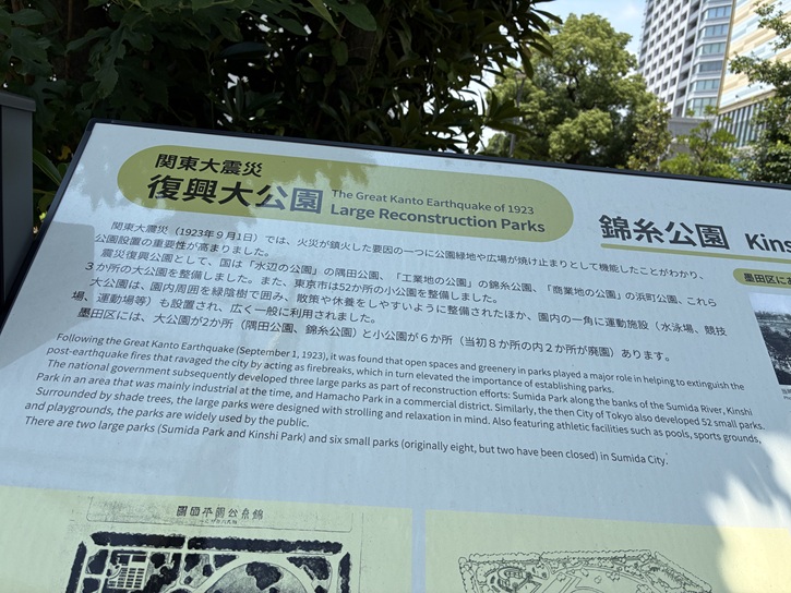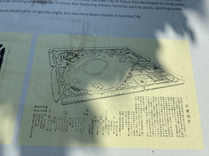 案内板には、錦糸公園の計画概要を図と共に記した文書が添えられています。旧字体で判読困難なために文字起こしは断念します。