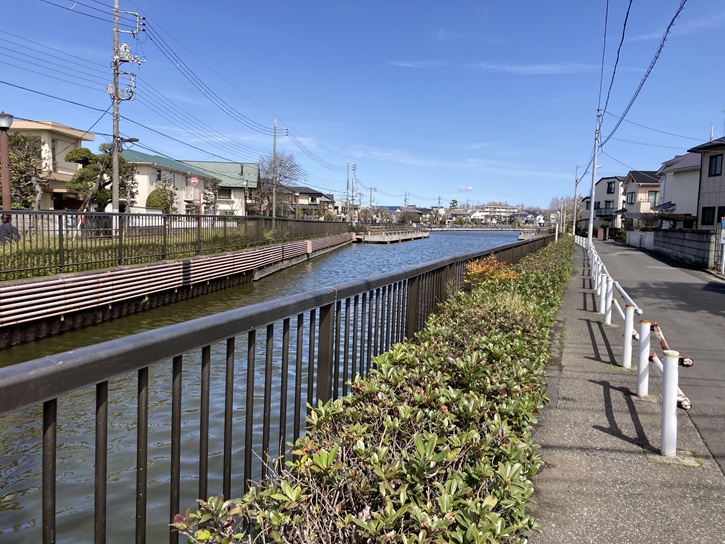 岩槻街道の岩槻橋交差点から、川のような湖のような水面が広がる内溜(うちだめ)の東岸を進みます。