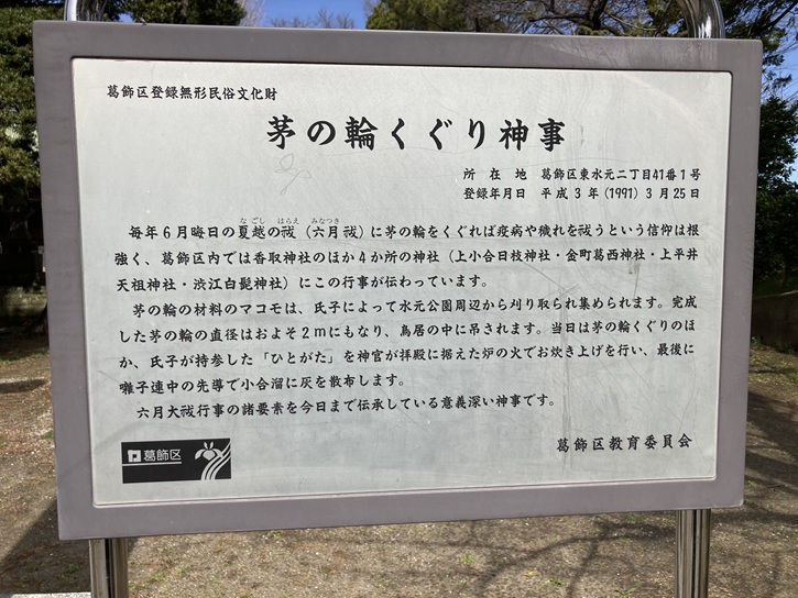 毎年6月晦日の夏越の祓(六月祓)に茅の輪をくぐれば疫病や穢れを祓うという信仰は根強く、葛飾区内では香取神社のほか4か所の神社(上小合日枝神社・金町葛西神社・上平井天祖神社・渋江白髭神社)にこの行事が伝わっています。茅の輪の材料のマコモは、氏子によって水元公園周辺から刈り取られ集められます。完成した茅の輪の直径はおよそ2mにもなり、鳥居の中に吊されます。当日は茅の輪くぐりのほか、氏子が持参した「ひとがた」を神官が拝殿に据えた炉の火でお炊き上げを行い、最後に囃子連中の先導で小合溜に灰を散布します。六月大祓行事の諸要素を今日まで伝承している意義深い神事です。