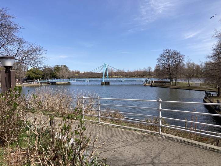 内溜と外溜の境の遊歩道を通って対岸に渡ります。右手には水元公園のシンボルともいえる全長70mほどの水元大橋が架かっています。1973年に竣工し、何度か改修が施されています。水面に近い高さに橋があるのは、水量の上下がほとんどない水元小合溜にかかる橋ならではです。幅がそれほど広くないので、人が多い土日は混雑します。
