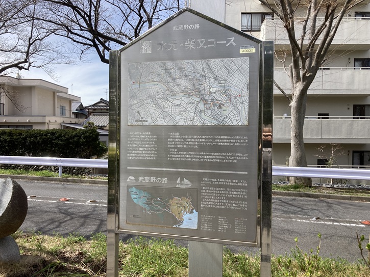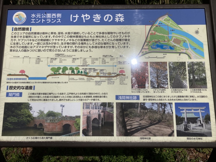 水元公園は、昭和四十年(1965年)4月1日に開園した面積96.3haの都内23区の中でも最大規模の都立公園です。この地域は元々は古利根川の河川敷でした。徳川三代将軍家光の江戸川改修事業により古利根川が廃止されたため、小合村が江戸幕府の許可を得て埋め立てて耕作地として、水を蓄えて小合溜と称して管理してきました。水元公園は、その小合溜という準用河川を中心とした水域面積の多い水郷公園です。小合溜から引いた大小の水路が園内を走り、水郷景観を作りだしています。園内にはポプラ並木やメタセコイアの森・ハンノキなど水辺に強い樹木が約2万本生育し、ハナショウブ・スイレン・コウホネといった水生植物を多く見ることができます。桜の咲く季節やハナショウブの咲く季節は花見客などで賑わいます。公園西側を通る桜堤通りは園内随一の桜の見所となっています。公園内には、中央広場・バードサンクチュアリー・バーベキュー広場・はなしょうぶ園・メタセコイアの森・水産試験場跡地に造成された水辺のさと・冒険広場・集会所(涼亭)・キャンプ広場・ドッグラン・グリーンプラザ・水辺の生きもの館などの多様な施設が設けられ、季節を問わず週末を中心に余暇を楽しむ訪問客で賑わいます。武蔵野の路の案内板に、水元公園と小合溜の解説があります。