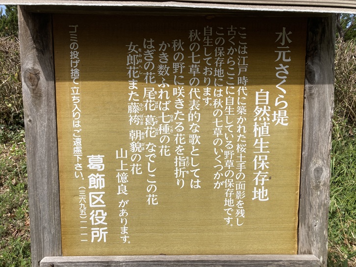 ここは江戸時代に築かれた桜土手の面影を残し、古くからここに自生している野草の保存地です。この保存地には秋の七草のいくつかが自生しております。秋の七草の代表的な歌としては、