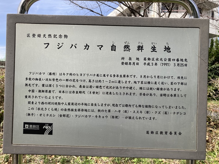 これは「ふじばかま(藤袴)」です。石碑の隣に案内板が立っています。