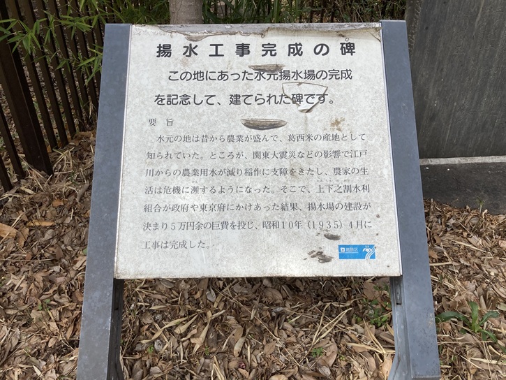水元の地は昔から農業が盛んで、葛西米の産地として知られていた。ところが、関東大震災などの影響で江戸川からの農業用水が減り稲作に支障をきたし、農家の生活は危機に瀕するようになった。そこで、上下之割水利組合が政府や東京府にかけあった結果、揚水場の建設が決まり5万円余の巨費を投じ、昭和十年(1935年)4月に工事は完成した。
