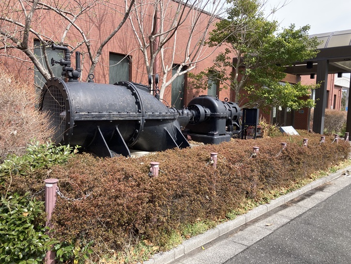 水元揚水場で使用されていた巨大なポンプが保存・展示されています。