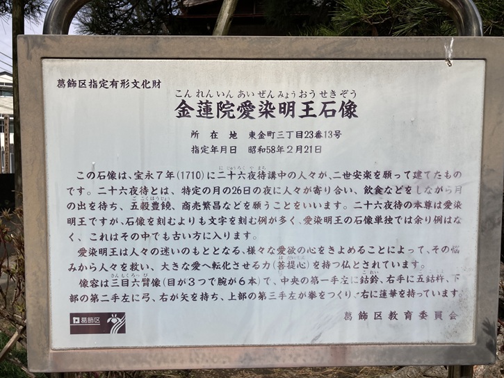 この石像は、宝永七年(1710年)に二十六夜待講中の人々が、二世安楽を願って建てたものです。二十六夜待とは、特定の月の26日の夜に人々が寄り合い、飲食などをしながら月の出を待ち、五穀豊饒、商売繁昌などを願うことをいいます。二十六夜待の本尊は愛染明王ですが、石像を刻むよりも文字を刻む例が多く、愛染明王の石像単独では余り例はなく、これはその中でも古い方に入ります。愛染明王は人々の迷いのもととなる、様々な愛欲の心をきよめることによって、その悩みから人々を救い、大きな愛へ転化させる力(菩提心)を持つ仏とされています。像容は三目六臂像(目が3つで腕が6本)で、中央の第一手左に鈷鈴、右手に五鈷杵、下部の第二手左に弓、右が矢を持ち、上部の第三手左が拳をつくり、右に蓮華を持っています。