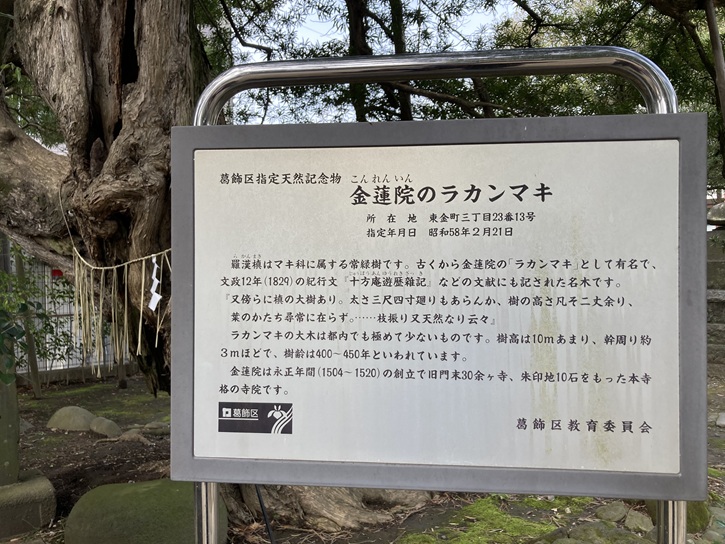 羅漢槙はマキ科に属する常緑樹です。古くから金蓮院の「ラカンマキ」として有名で、文政十二年(1829年)の紀行文「十方庵遊歴雑記」などの文献にも記された名木です。「又傍らに槙の大樹あり。太さ三尺四寸廻りもあらんか、樹の高さ凡そ二丈余り、葉のかたち尋常に在らず。・・・枝振り又天然なり云々」ラカンマキの大木は都内でも極めて少ないものです。樹高は10mあまり、幹周り約3mほどで、樹齢は400年〜450年といわれています。金蓮院は永正年間(1504年〜1520年)の創立で旧門末30余ヶ寺、朱印地10石をもった本寺格の寺院です。