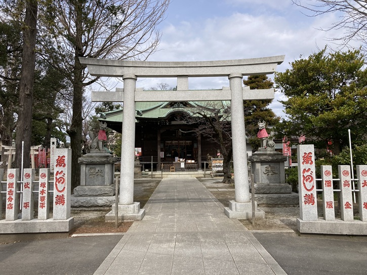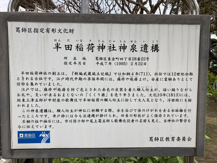 半田稲荷神社は、和銅四年(711年)の創建とも、永久年間(1113年〜1117年)の創建ともいわれる古社です。江戸中期以降は麻疹と安産の神様として知られ、歌舞伎や狂言にも描かれています。子供の疱瘡(天然痘)・麻疹・安産祈願の参詣者が多く、明和・安永(1764年〜1781年)の頃には、疱瘡や麻疹を防ぐ色とされた赤色の服を着た願人坊主が半田稲荷の幡を持って「葛西金町半田の稲荷、疱瘡も軽い麻疹も軽い・・・」と節面白く全国を謡い踊り歩いたといわれ、願人坊主は江戸の人びとに評判となり、歌舞伎や狂言・舞踊でも演ぜられるようになり、浮世絵にも描かれました。境内御神水の玉垣には、市川團十郎や尾上菊五郎などの歌舞伎役者の名前が彫られています。