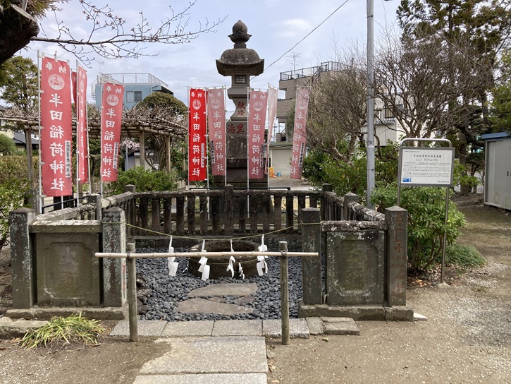 半田稲荷神社の創立は、「新編武蔵風土記稿」では和銅四年(711年)、社伝では12世紀初期とされる古社です。江戸時代中期の享保年間には、麻疹や疱瘡よけ、安産に霊験ありとして信仰を集めていました。江戸では、麻疹や疱瘡を防ぐ色とされた赤色の衣装を着た願人坊主が、謡い踊りながらお札や、災いが去るおまじないの「くくり猿」を売り歩きました。文化十年(1813年)には、坂東三津五郎が中村座の歌舞伎で半田稲荷の願人坊主に扮して大人気となり、浮世絵にも描かれました。この神泉遺構は、願人坊主が神仏に祈願する際、水を浴びて体のけがれを去る水垢離を行ったところです。井戸枠には今も注連縄が掛けられ、旧来の形状がよく保存されています。石棚の柱や袖石には、市川団十郎や尾上菊五郎ら歌舞伎役者の名前も見え、当神社の繁栄を今に伝えています。