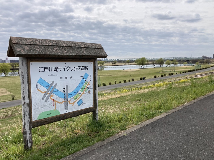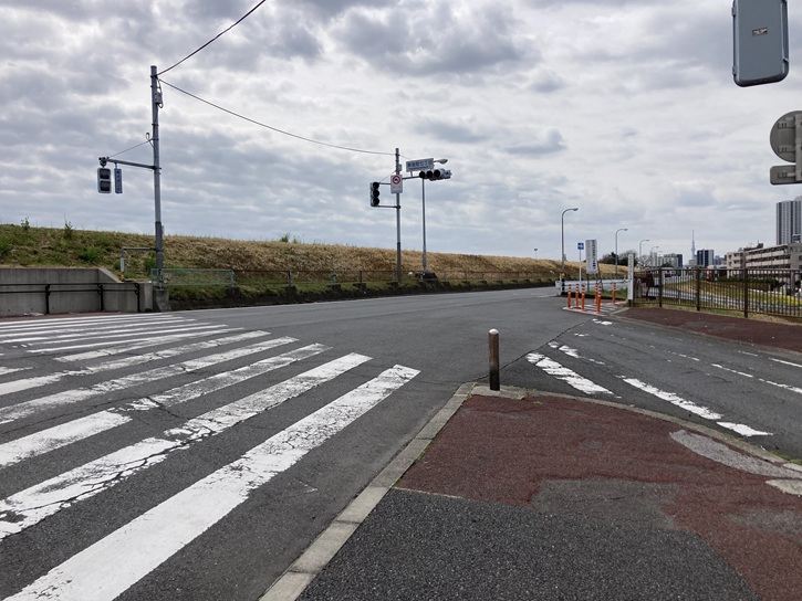 東金町七丁目交差点で都道451号江戸川堤防線を渡って江戸川堤サイクリング道路に出ます。