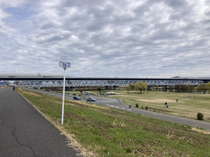 江戸川堤サイクリング道路の前方に、長大な橋梁が架かっています。道路を高架で交差するのは、東京外環自動車道で、その脇には葛飾大橋が架かっています。騒音防止のためか、東京外環自動車道は円筒形になっています。