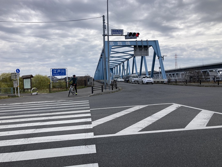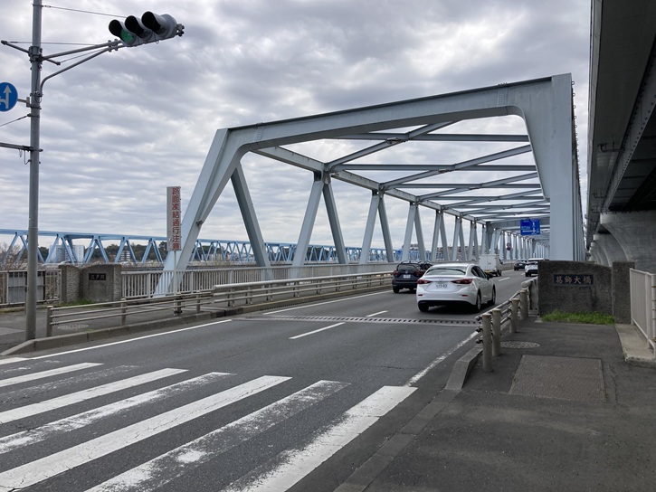 葛飾大橋の先には葛飾橋が架かっています。東京外環自動車道を挟んで左右2本架かっているトラス橋は、どちらも国道298号線を通す葛飾大橋です。葛飾橋は県道54号線を通しています。江戸時代には幕府防衛のために江戸川に橋は存在せず、対岸に渡るには渡し舟を利用していましたが、明治に入ってから葛飾橋が架けられました。江戸時代には、葛飾橋の北方500m辺りの地点に金町松戸関所がありました。