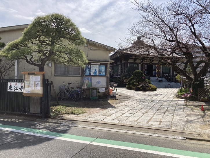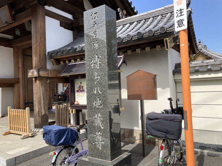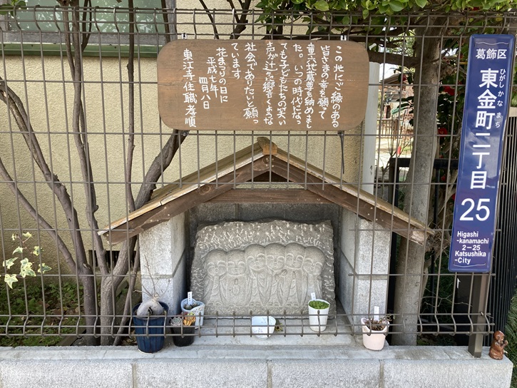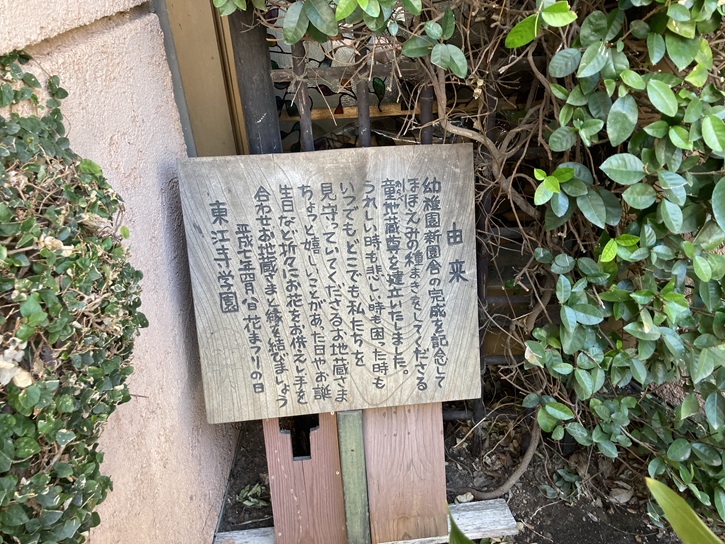 岩槻街道を渡った先に、東江寺があります。その付属幼稚園の角地にお地蔵様が鎮座しておられます。