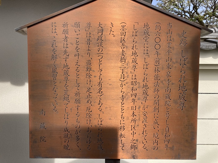 当山は業平山東泉寺南蔵院と号し、貞和四年(約600年前)林能法師の開創に成い、境内の地蔵堂には「しばられ地蔵尊」が安置されている、「しばられ地蔵尊」は昭和四年旧本所区中之郷(墨田区吾妻橋三丁目)から寺とともに移転してきた。大岡政談の一つとしても有名である「しばられ地蔵尊」は昔より、盗難除け、足止め、厄除け、あらゆる願いごとを叶えるとして祈願するものが多く、祈願者は先ず地蔵尊を荒縄でしばり、成就の暁には、これを解く風習となっている。