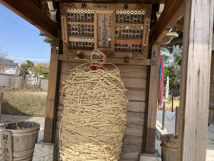 しばられ地蔵尊は像高1メートルほどの石の地蔵尊で、元禄十四年(西暦1701年)の造立と伝えられています。「文政寺社書上」によりますと、この地蔵尊は諸願成就、殊に難病平癒に霊験があり、信心の者が祈願するときは地蔵尊を縄で縛り、成就したときには縄を解くことから、しばられ地蔵と称したと記されています。毎年12月31日(大晦日)の午後11時から、南蔵院住職による「願かけしばられ地蔵尊」の縄解き供養が行われ、解かれた縄は祈祷護摩の火でお焚き上げされます。もうじき年も明けようという頃、住職が除夜の一番鐘を撞き、年が改まったところで地蔵尊に新年の一番縄が結ばれます。参詣の人々は、一年に一度縄を解かれた地蔵尊のお姿を拝み、除夜の鐘を撞き、そして新たに地蔵尊に願かけの縄を結び、新年の願いを託すのです。供養の間、住職や衆僧により聲明が唱えられ、境内に新設された舞台では「伶楽舎」による雅楽の演奏が行われます。荘厳な音の世界に浸りながら、新年を迎える儀式が執り行われます。大晦日と元日には、厄除けから縁結びまであらゆる願い事を結ぶ開運の縁起「結びだるま市」が開かれます。